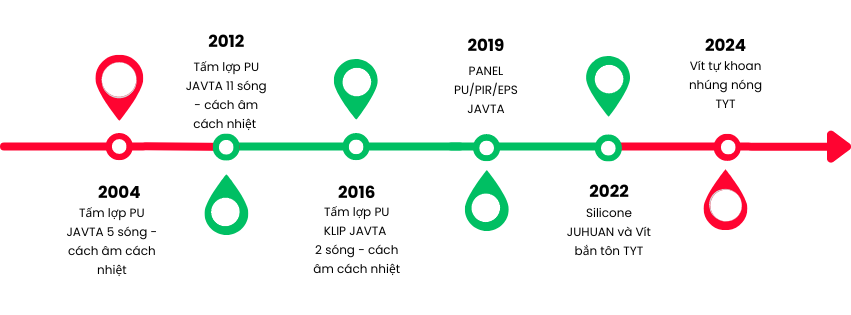 Năm 2004 sản phẩm Tấm lợp PU JAVTA 5 sóng - cách âm cách nhiệt công nghiệp chính thức được cung cấp ra thị trường Việt Nam. Sản phẩm đã được sự ủng hộ của khách hàng ngay từ những ngày đầu đến giờ với hàng ngàn công trình công nghiệp cũng như dân dụng.