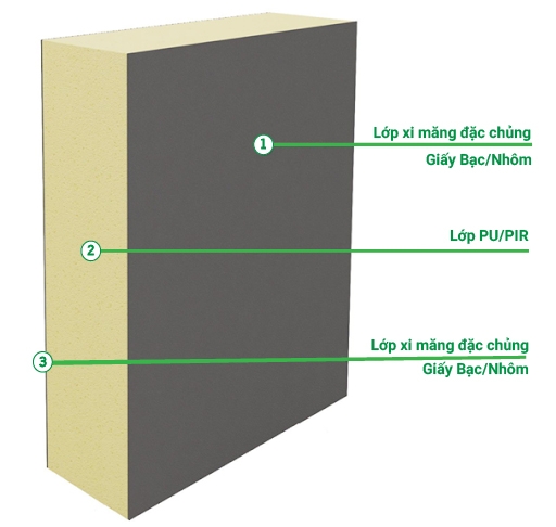 Tấm PIR cách nhiệt có cấu tạo bởi 3 lớp với 2 lớp ngoài là xi măng polyme đặc chủng, giấy bạc hoặc nhôm và 1 lớp lõi PIR có khả năng chống nóng, cách nhiệt, chống nước và chống cháy lan tuyệt đối.